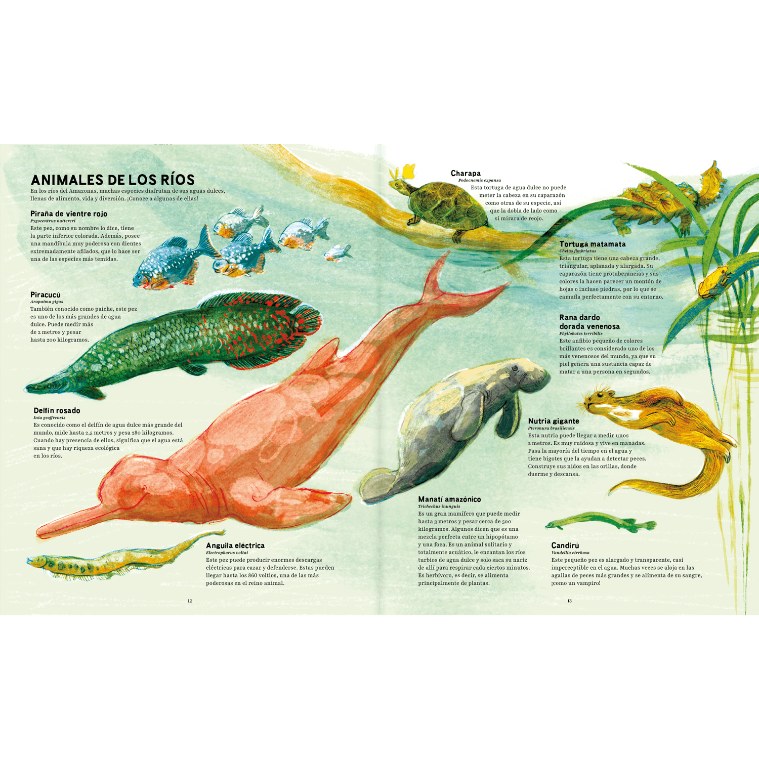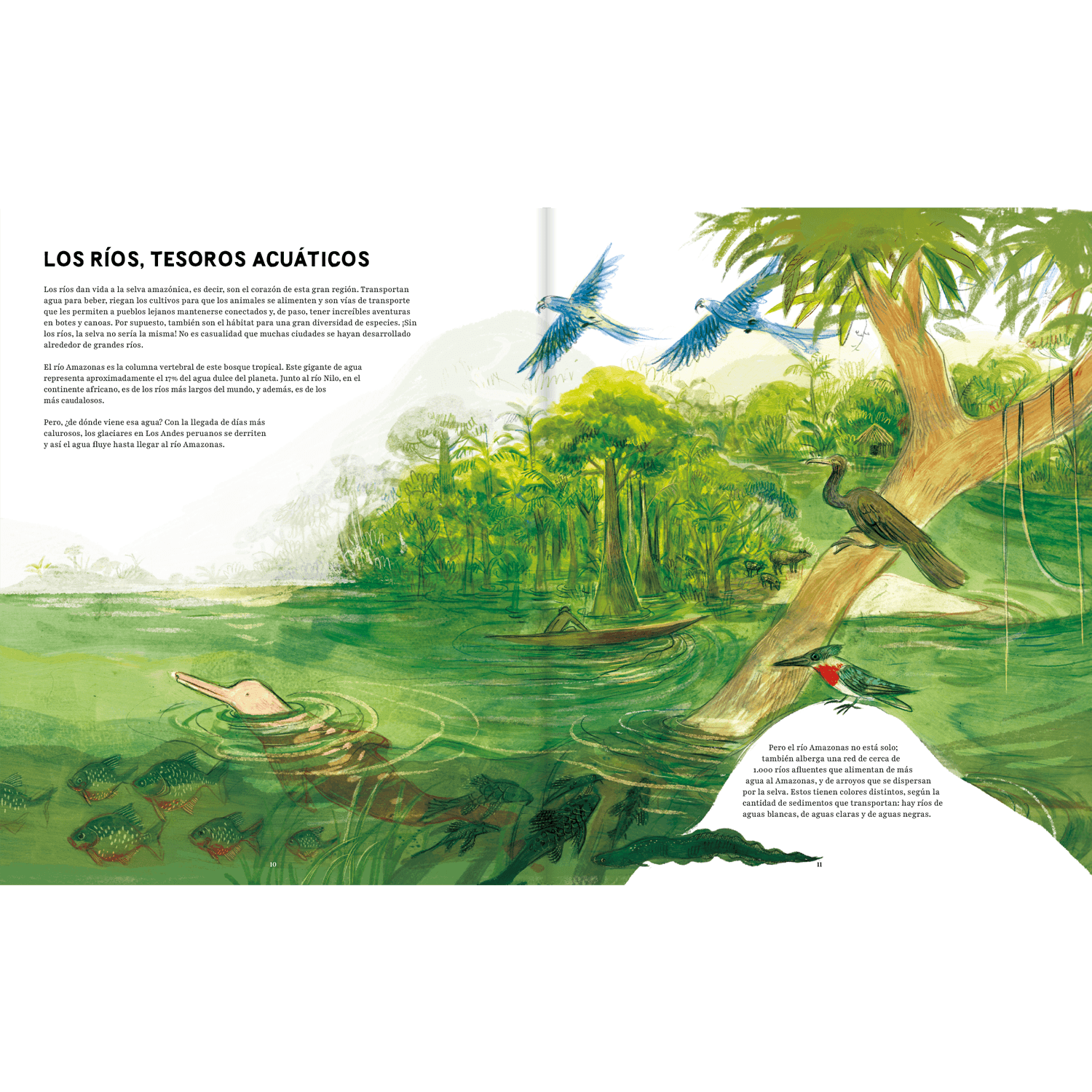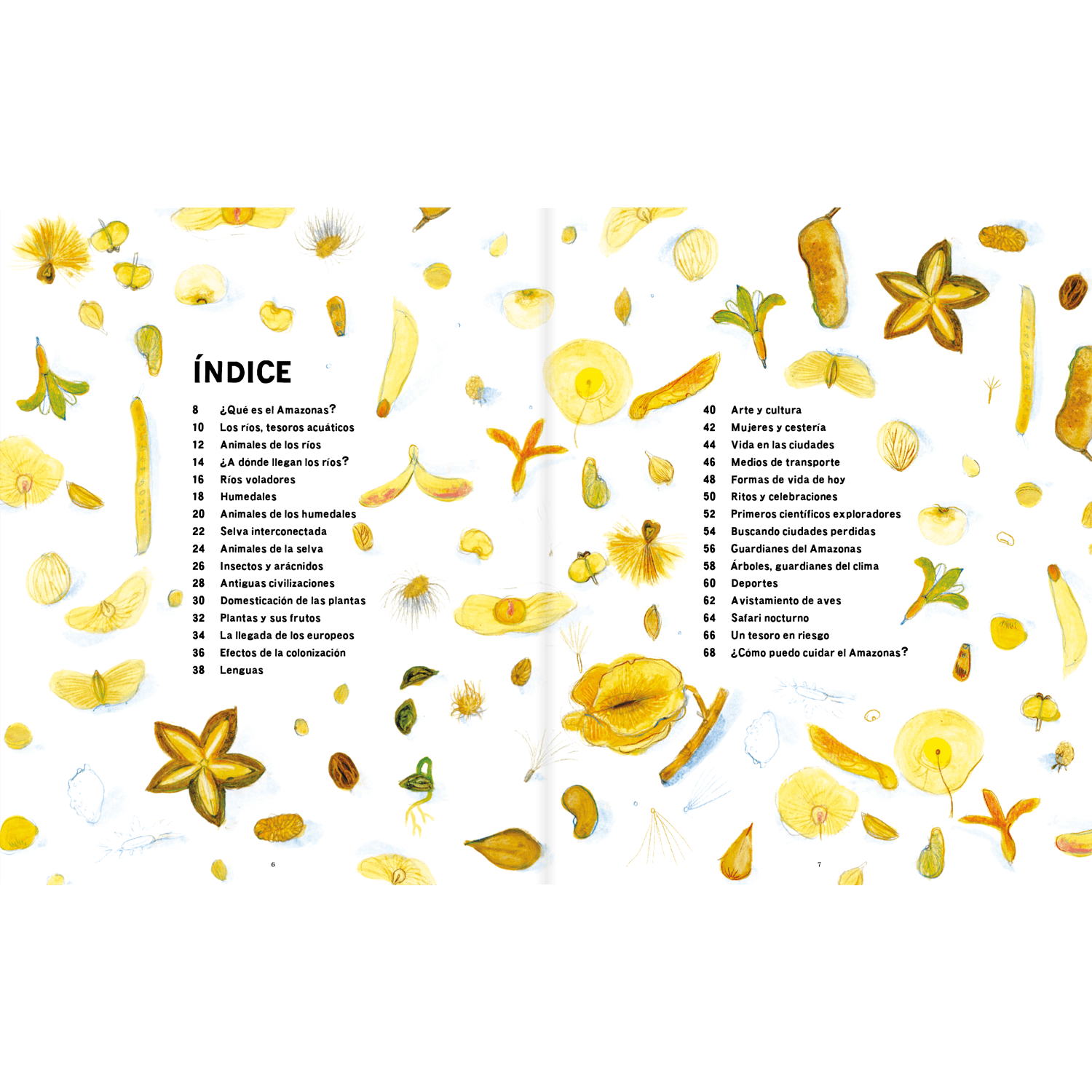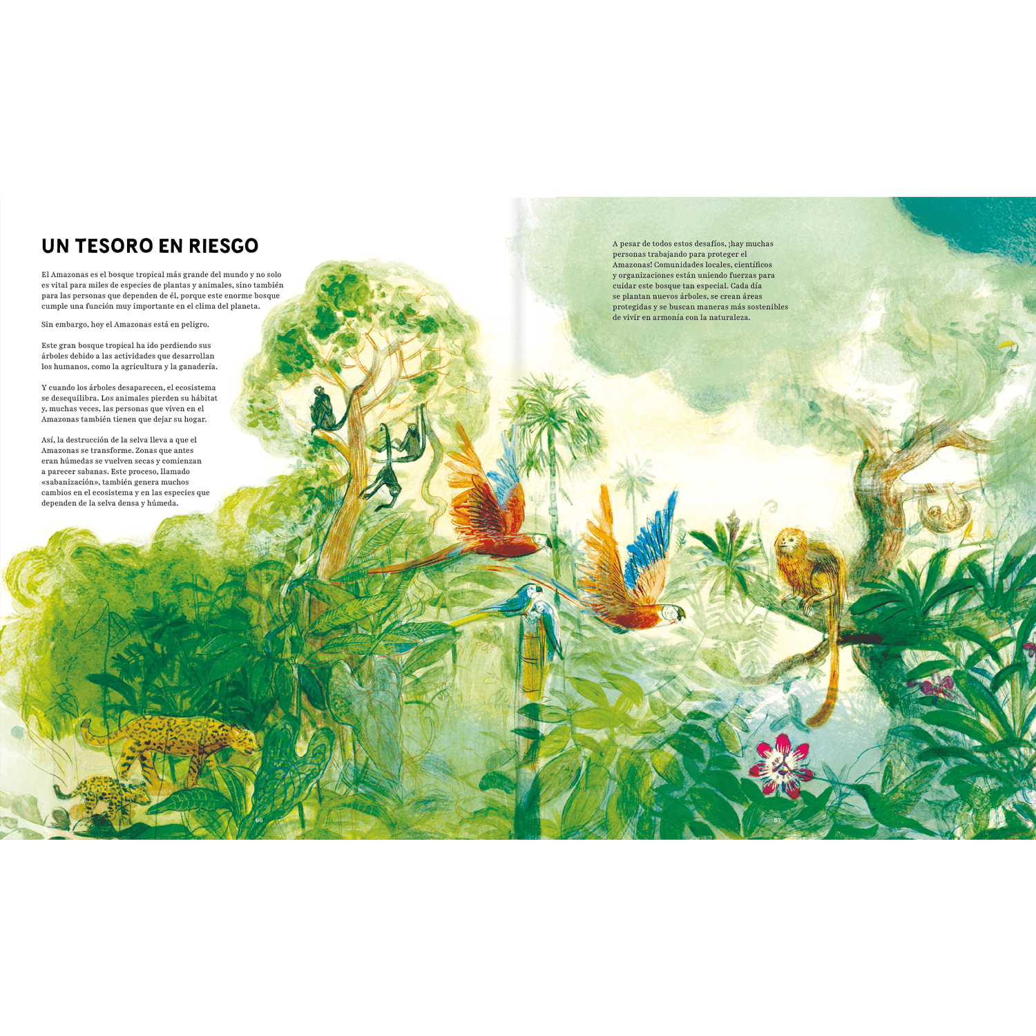 Organizado en capítulos breves y claros, el libro presenta la enorme biodiversidad del Amazonas, desde los animales de río, humedales y selva hasta insectos sorprendentes y árboles que regulan el clima. También aborda las antiguas civilizaciones amazónicas, la domesticación de plantas, la vida actual en ciudades y comunidades, ritos y celebraciones, exploradores, defensores del bosque y propuestas concretas para que niñas y niños participen en su protección.
